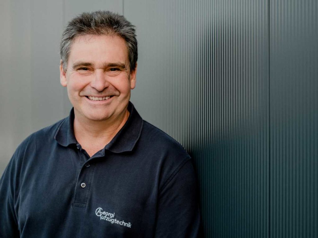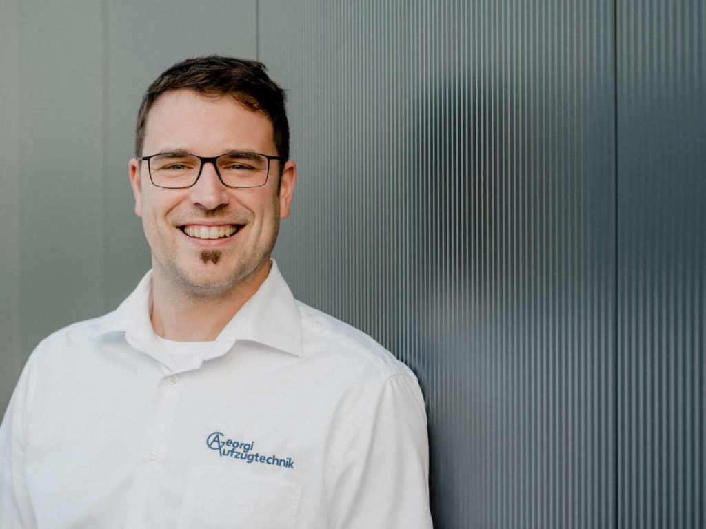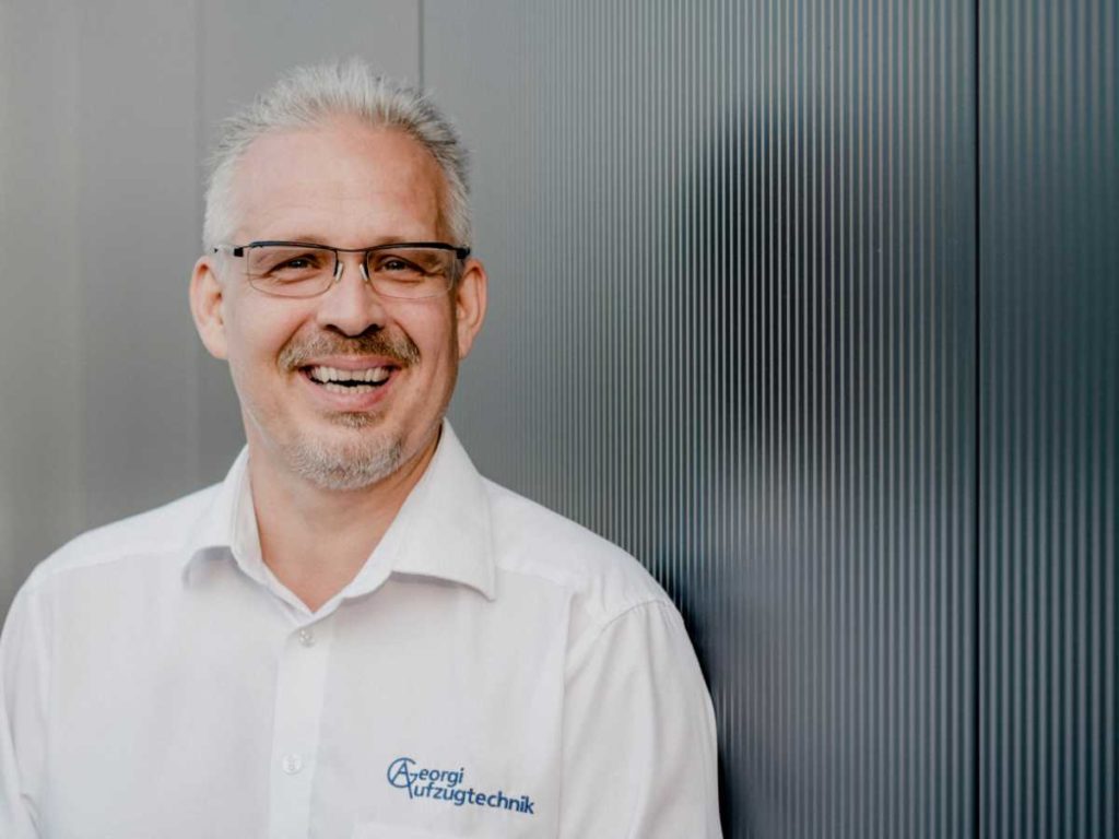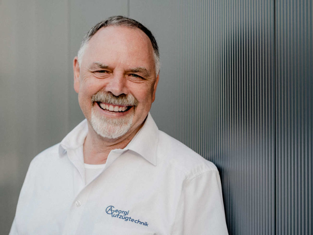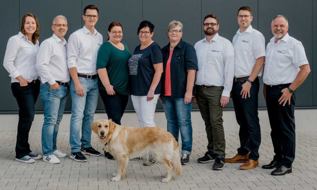 Helena Georgi (v. l.), Jörg Künzel, Nikolai Wlasenko, Kerstin Bedrunka (Assistentin Service), Sylvia Buschery (Sekretariat, Rechnungswesen), Monika Hünnies (Rechnungswesen, Personalwesen, Assistentin Neubau), Sebastian Weber, Matthias und Jürgen Georgi sowie Bürohund Leni.